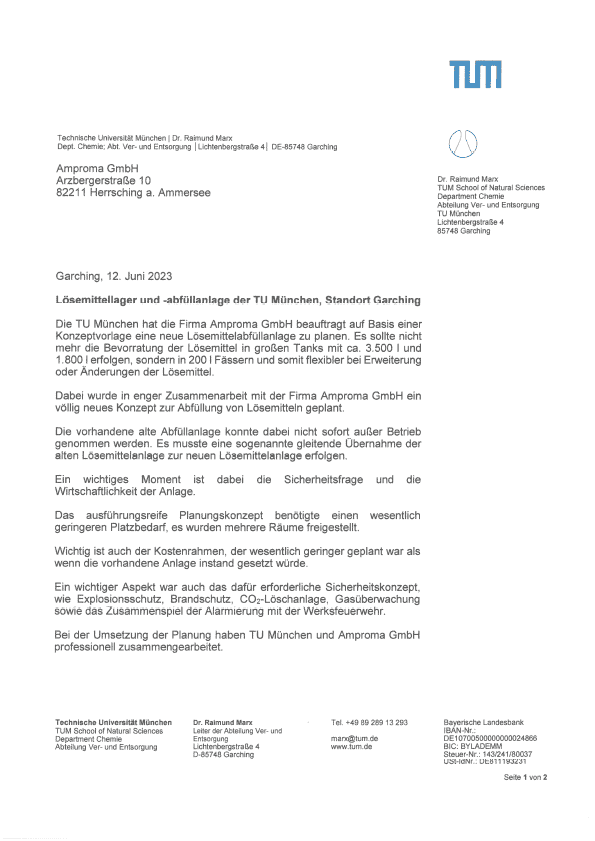 Die TU München hat die Firma Amproma GmbH beauftragt auf Basis einer Konzeptvorlage eine neue Lösemittelabfüllanlage zu planen. Es sollte nicht mehr die Bevorratung der Lösemittel in großen Tanks mit ca. 3.500 l und 1.800 l erfolgen, sondern in 200 l Fässern und somit flexibler bei Erweiterung oder Änderungen der Lösemittel. Dabei wurde in enger Zusammenarbeit mit der Firma Amproma GmbH ein völlig neues Konzept zur Abfüllung von Lösemitteln geplant und umgesetzt.